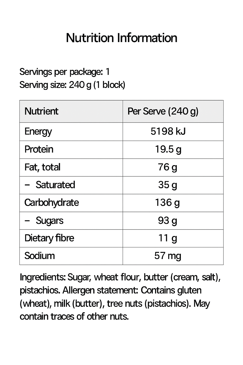 Contains tree nuts (pistachio), dairy, soy. Made in a commercial kitchen that also handles gluten and other tree nuts.